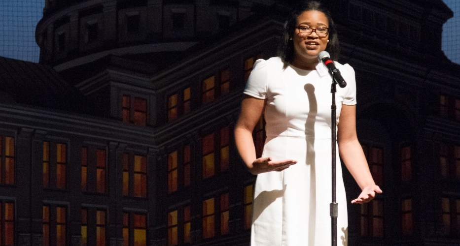 Carmen Tafolla, the 2015 Texas Poet Laureate, served as master of ceremonies for the event. Poets Laurie Filipelli, Carrie Fountain, Brian Francis and Tomás Q. Morín judged 25 students, each having first won their school competition, on articulation, evidence of understanding, accuracy and overall performance.